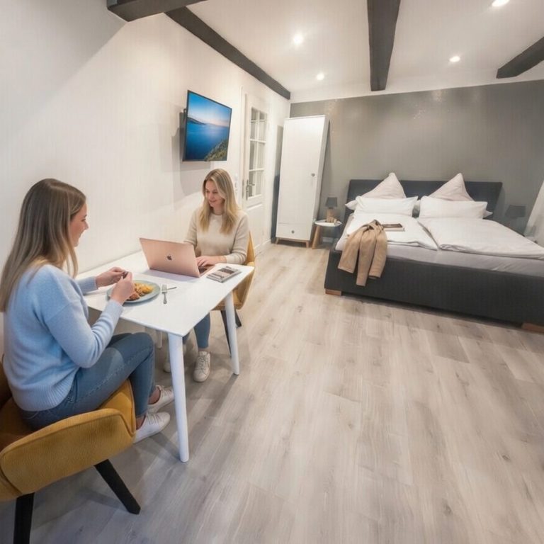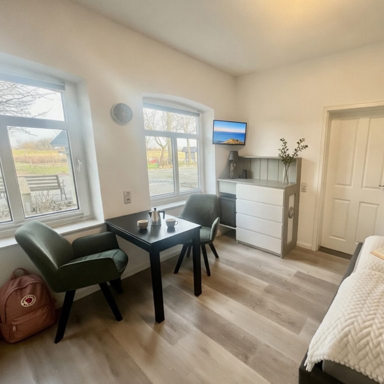Nr. 3 bietet genug Platz für längere Aufenthalte und sorgt so für den perfekten Komfort. Mit einer eigenen Terrasse und direktem Zugang zum Garten habt ihr hier viel Raum zum Entspannen. Auch im Zimmer findet sich ein kleiner Kühlschrank für eure Erfrischungen. Genießt den Sonnenuntergang mit einem Glas Wein und freut euch auf das nächste Frühstück – der perfekte Abschluss eines entspannten Tages.