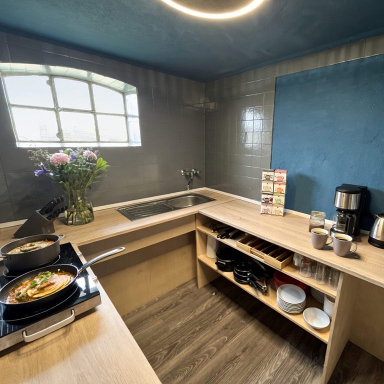In unserer Tiny Gemeinschaftsküche ist das nötige Zubehör vorhanden, damit du dir einen Snack zubereiten kannst. Die Zutaten musst du allerdings selbst mitbringen. Außerdem steht ein kleiner Vorrat an Kaffee und Tee bereit – perfekt, um sich jederzeit eine gemütliche Auszeit zu gönnen.